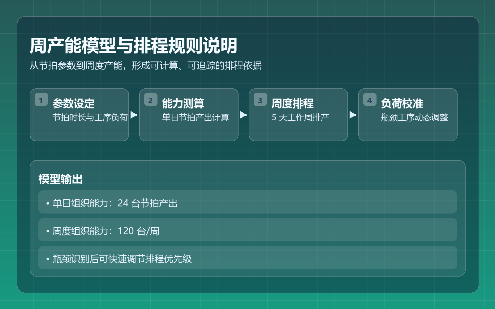 - 建立单日 24 台、周度 120 台的节拍化产能模型。