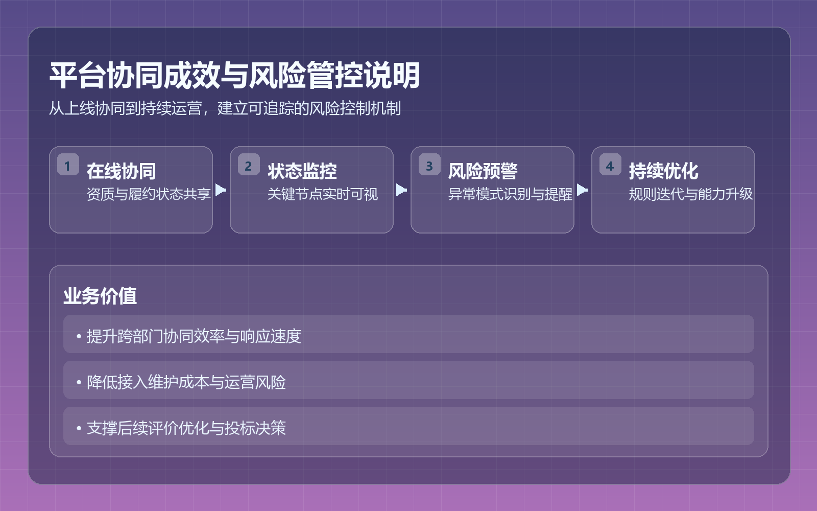 围绕供应商接入要求,完成数据链路与协同流程梳理,提升企业平台化协同能力。