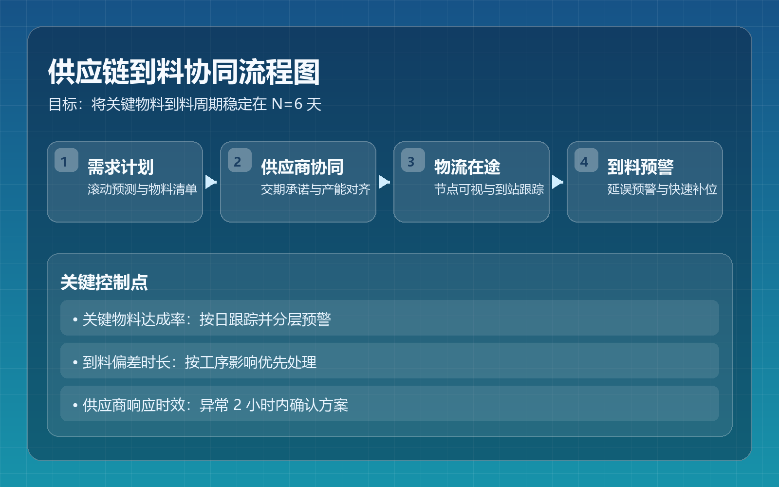 - N(采购与供应链):通过供应商协同、合同节奏、物流联动,实现 6 天到料目标。