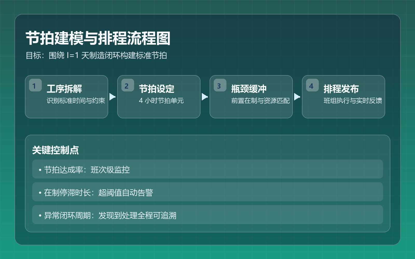 - 节拍建模:定义标准节拍、在制规则与资源匹配方案。